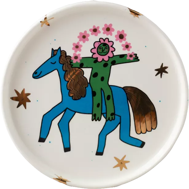 Agami 3 350 ₽Тарелка от творческого тандема мастерской Agami Ceramics и художницы Маши Сомик. На изделиях изображены: златогривая лошадка, ее дружок и россыпь игривых звезд и цветов, дополненные теплым пожеланием.
