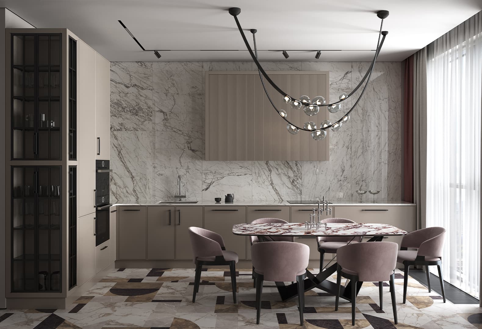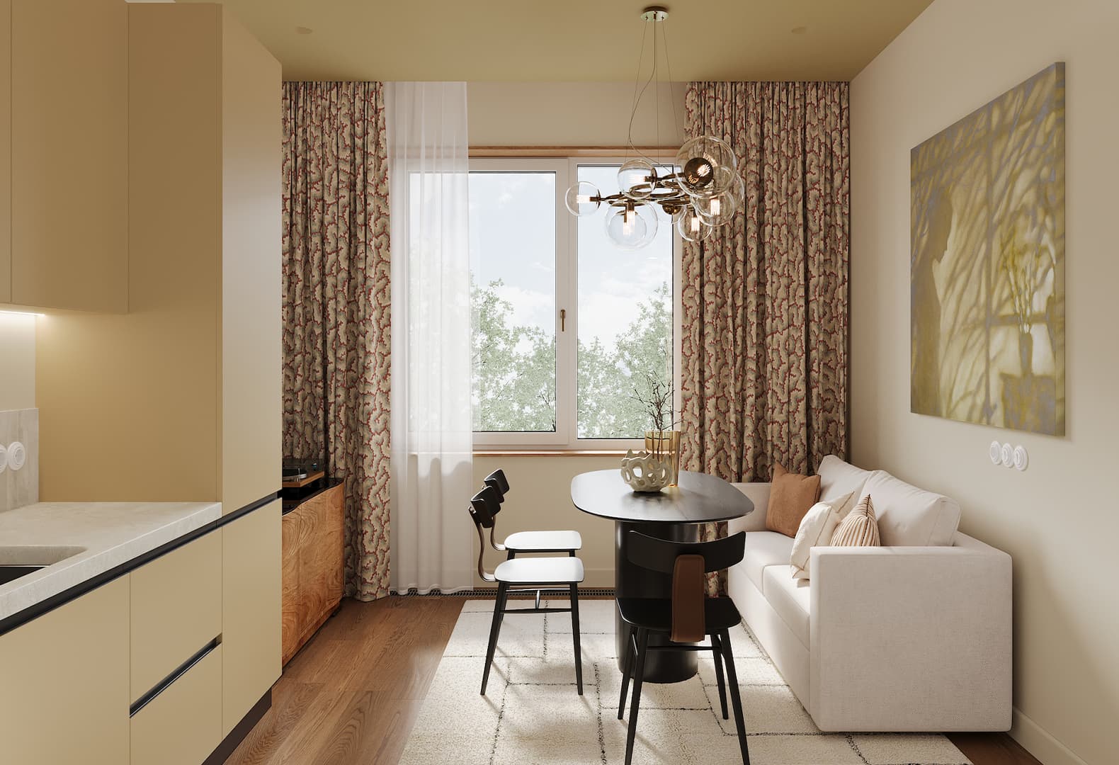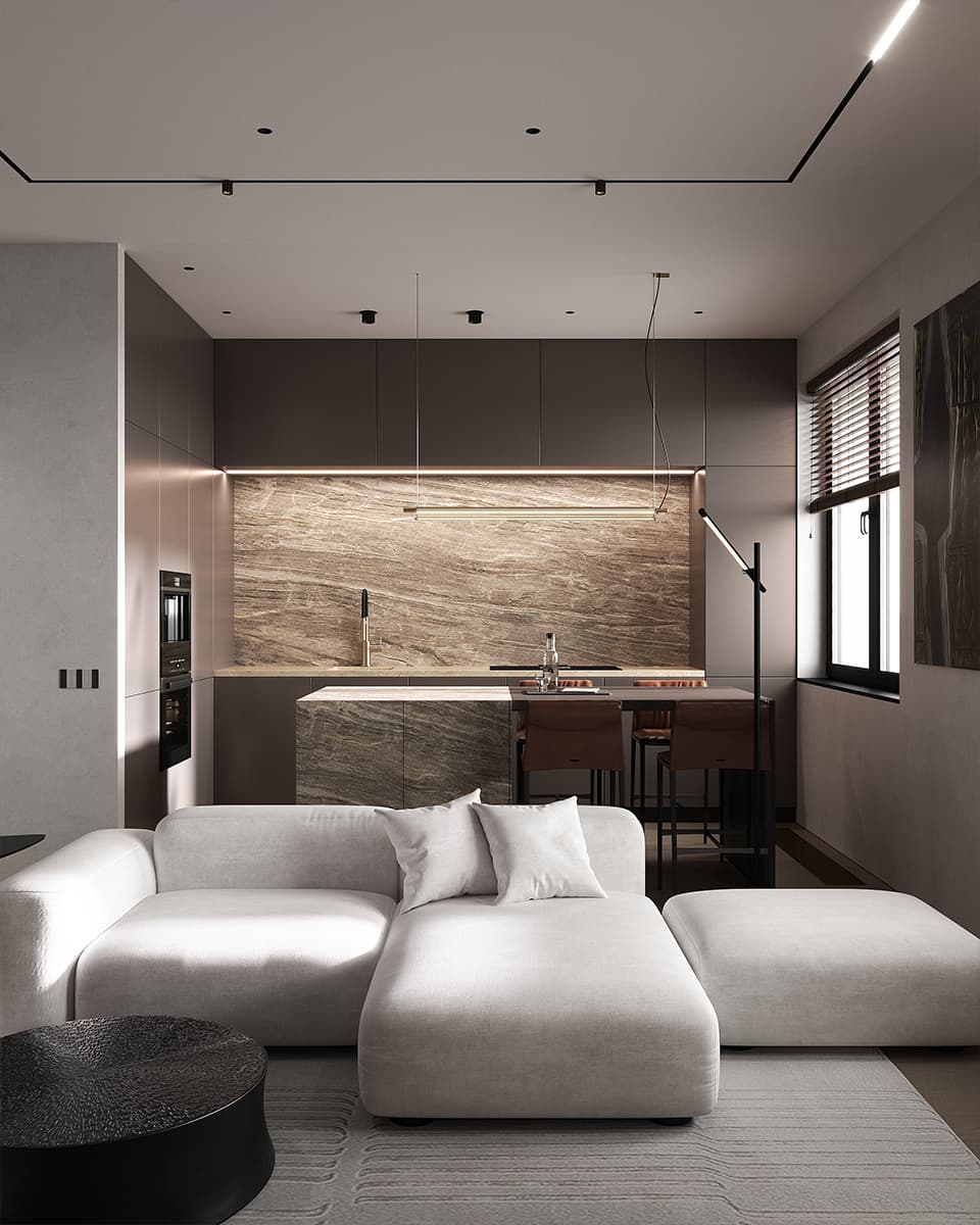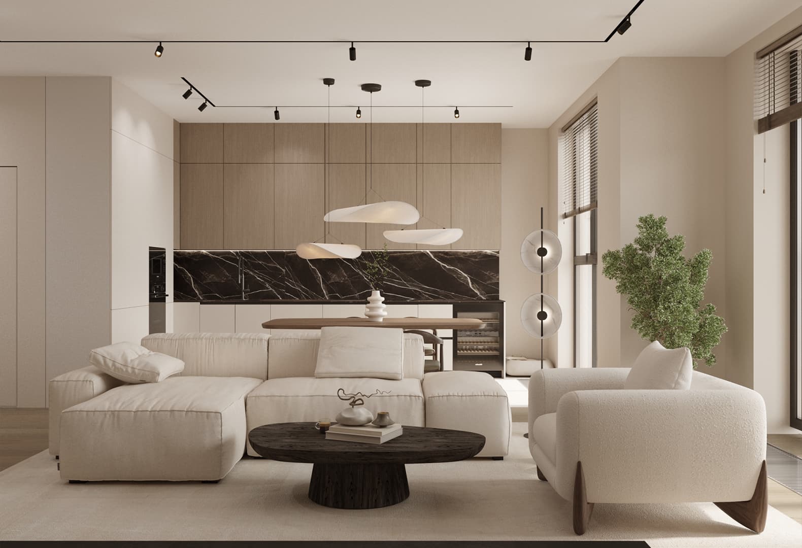 Концепция интерьера квартиры площадью 94 кв. м выполнена в эстетике минимализма, который соответствует характеру, статусу и образу жизни владельца — мужчины, занятого в банковской сфере. Автор объединила зоны кухни и гостиной для создания ощущения открытости и простора. Акцент в проекте сделан на базовых нейтральных тонах и природных материалах, а предусмотренные панорамные окна позволяют визуально расширить пространство.