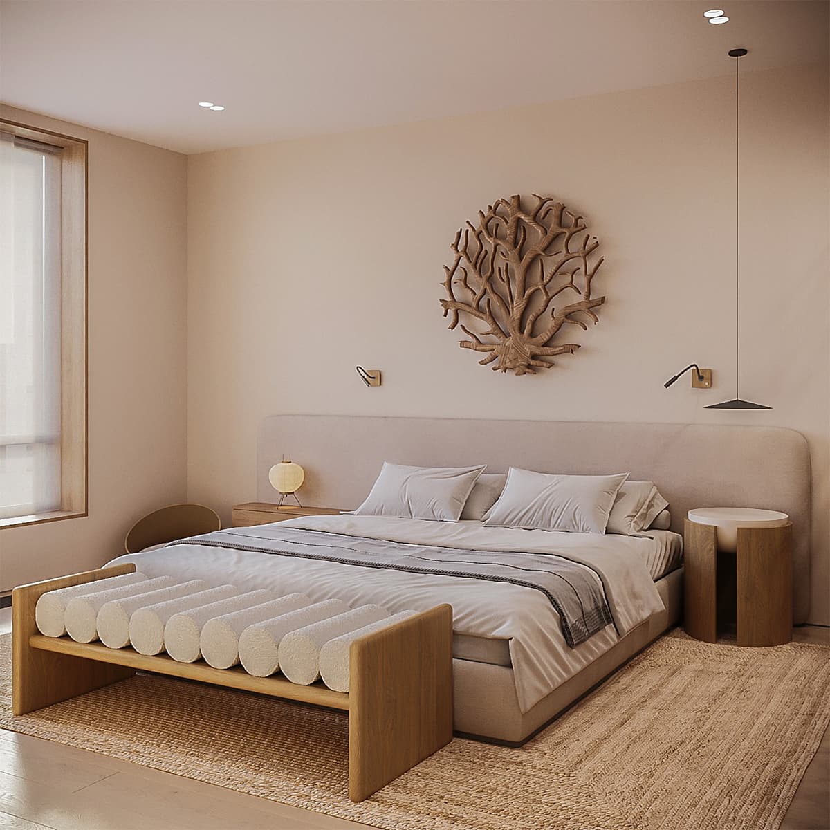 Ключевые характеристики этого проекта — внутренний покой и гармония. Дизайнер хотела создать воздушное, медитативное и тактильно разнообразное пространство для супругов с 8-летним сыном. Чтобы избежать дополнительного визуального шума, автор интегрировала в потолок каждого помещения встроенные гипсовые светильники. Среди выбранных оттенок выделяется цвет Pantone Pear Sorbet, который использован в отделке мастер-спальни.