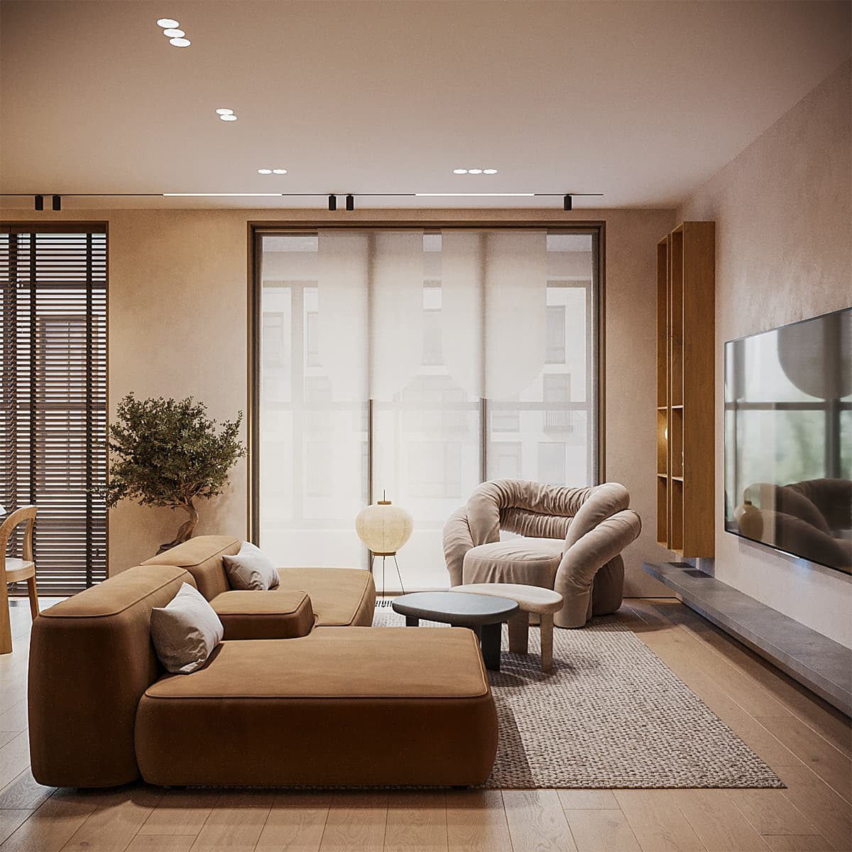 Этот интерьер выполнен в современном стиле с элементами джапанди. Так как концепция разрабатывалась для семьи из трех человек, дизайнер предусмотрела личное пространство для каждого. В центре квартиры находится общественная зона для совместного отдыха и общения: заказчики видели ее как воздушное и комфортное помещение, одинаково подходящее для тихих семейных вечеров и посиделок с гостями. Для хранения вещей здесь организованы вместительные шкафы и комоды, а также отдельная гардеробная.