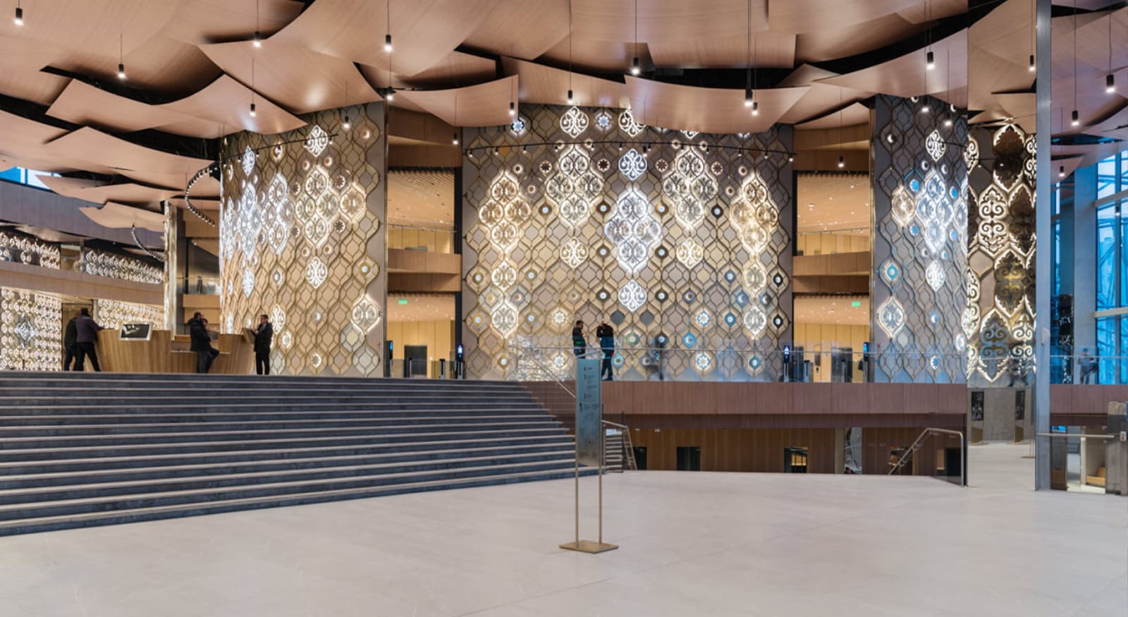 Стены театра украшены узорами, вдохновленными традиционными татарскими женскими украшениями. Днем лепестки взаимодействуют с естественным светом, меняя облик в зависимости от времени суток, а ночью оживают благодаря искусственному освещению. Контражурная подсветка подчеркивает детали и добавляет объем. Дополняет образ подвесная система прожекторов, повторяющая изгиб лепестков и создающая эффектные блики на золотых узорах.
