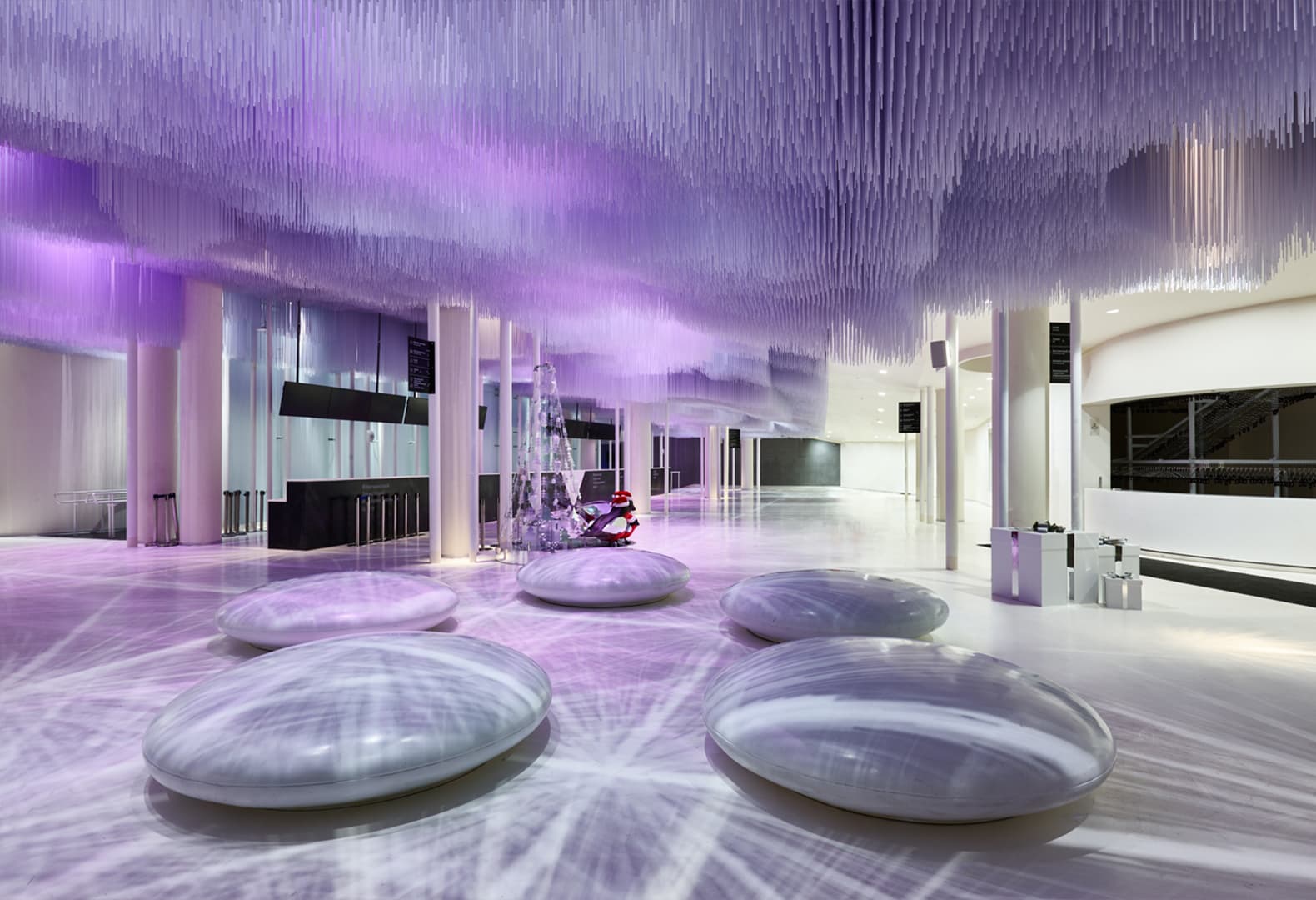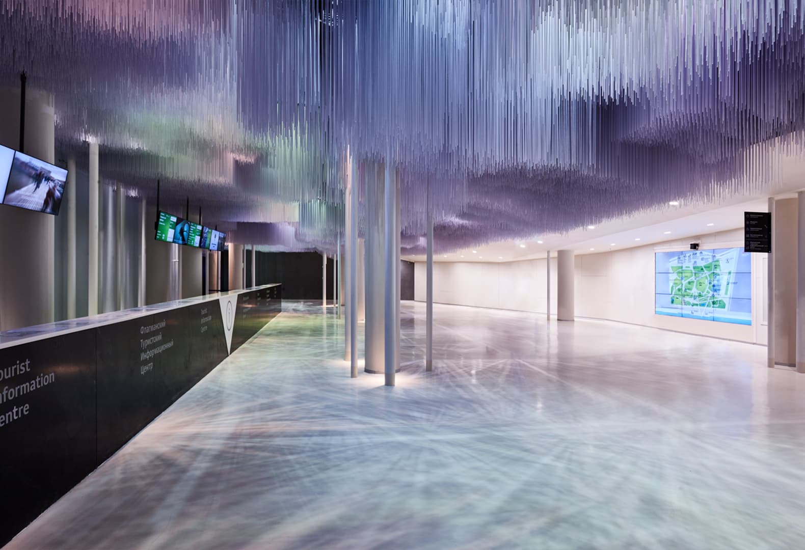 Внутреннее пространство демонстрирует технологический потенциал. Главная визуальная доминанта интерьера — впечатляющий потолок, ставший узнаваемым символом интерьера здания. Архитекторы создали инсталляцию из поликарбонатных трубочек разной длины, формирующих объем на потолке. Для формирования комфортной световой среды и визуальных эффектов используются светильники с асимметричной оптикой. Мягкий свет на стенах передает объем помещения и акцентирует внимание на арт‑объекте из «нитей», а скрытые источники света создают эффект струящегося света. Специально разработанные световые сценарии позволяют наблюдать игру оттенков цвета и света, имитирующих небо и закат: переливы цвета от зеленого к фиолетовому формируют эффект «северного сияния» на авторской потолочной инсталляции. Преломление света в материале дополнительно создает на полу необычные светотеневые рисунки, напоминающие звездные лучи.