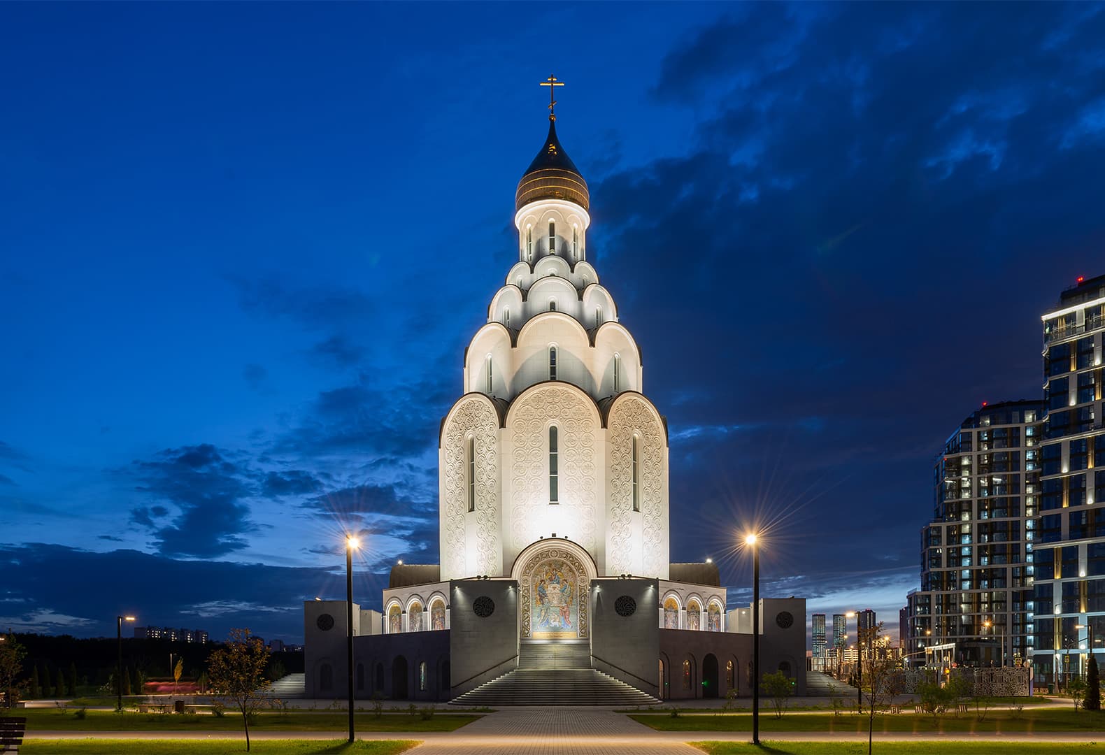 Белокаменный храм равноапостольного великого князя Владимира, созданный по проекту архитектурного бюро СПИЧ, отличает фасад с фактурным растительным орнаментом, благодаря которому классическая архитектура приобрела новый современный облик. Для храма было разработано световое решение, которое помогло сформировать особое восприятие сакрального через вечерний образ архитектуры. Архитектурное освещение помогает передать его чистоту и легкость. Кажется, будто здание парит над землей, устремляясь ввысь белоснежным фасадом. Это ощущение создается за счет того, что стилобатную часть, в которой располагается воскресная школа, решили не выделять светом. Контраст между темным нижним ярусом и белыми верхними ярусами в сумерках формирует визуальный эффект приподнятости здания. Такой прием подчеркивает возвышенный характер храма, а освещение входной группы обеспечивает композиционную связь между землей и небом.