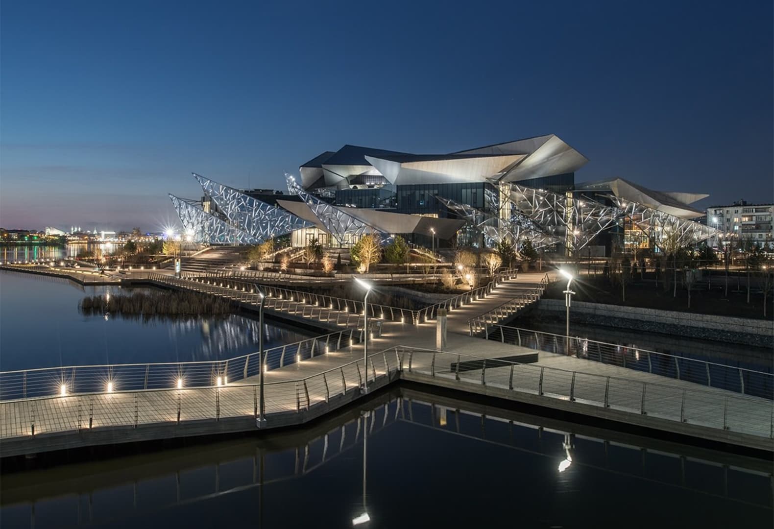Архитектурная особенность фасада Театра Камала — треугольные панели, напоминающие лепестки «ледяного цветка». Вечером они эффектно подчеркиваются светом. Каждый лепесток конструкции уникален, поэтому световые решения для них разрабатывались индивидуально. Благодаря системам управления освещением здание театра превращается в динамичный объект с «эмоциями»: по заданным сценариям оно становится ярче во время мероприятий, создавая торжественную атмосферу, а после завершения событий переходит в ночной режим, экономя энергию.