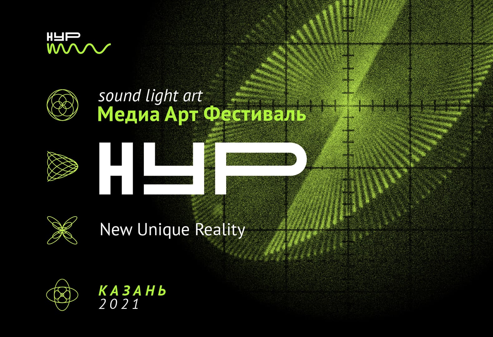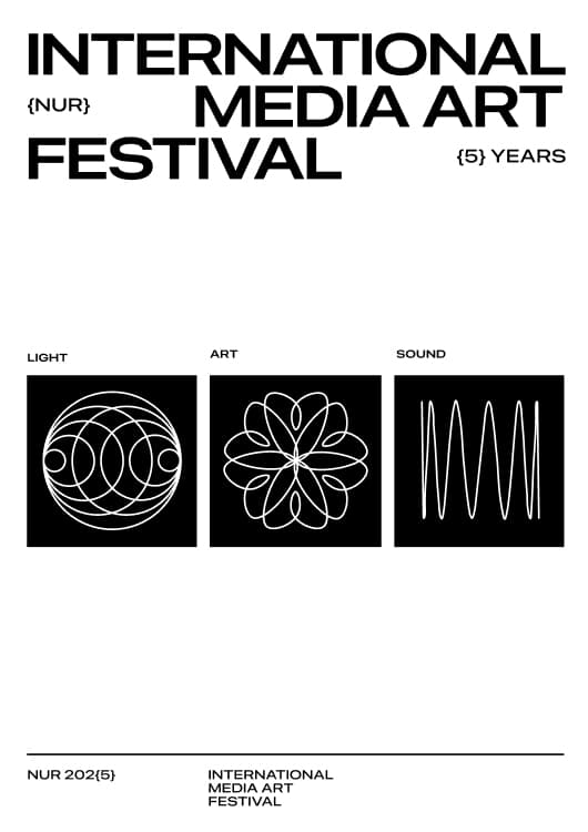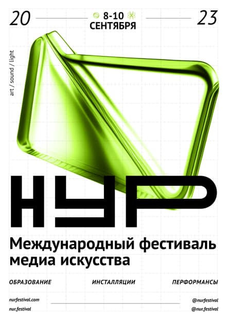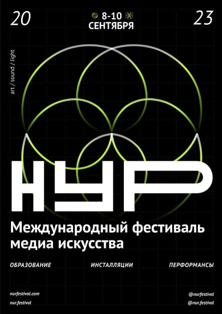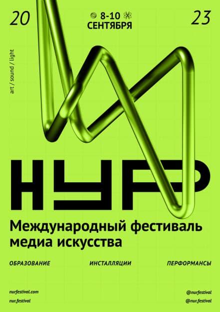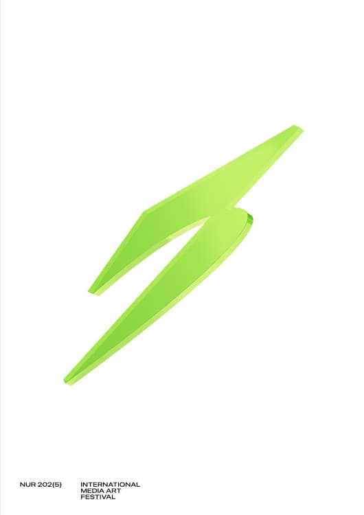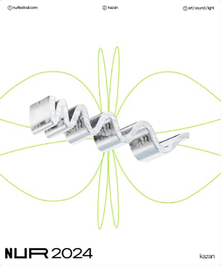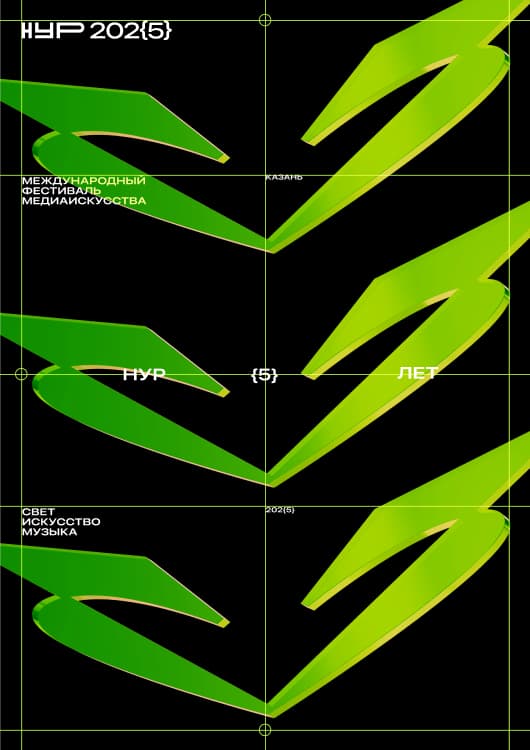 Фестиваль НУР запустили в 2021 году сооснователи студии formate Рашид Османов и Дидар Оразов. Слово «нур» в переводе с татарского языка означает «луч», а само название расшифровывается как «Новая Уникальная Реальность». Эту игру слов и смыслов дизайнеры перевели в язык сигналов: основой айдентики стала графика осциллографа — прибора, который визуализирует электрические импульсы. Такая метафора напрямую связана с природой медиаискусства, где свет, звук и данные превращаются в изображение.