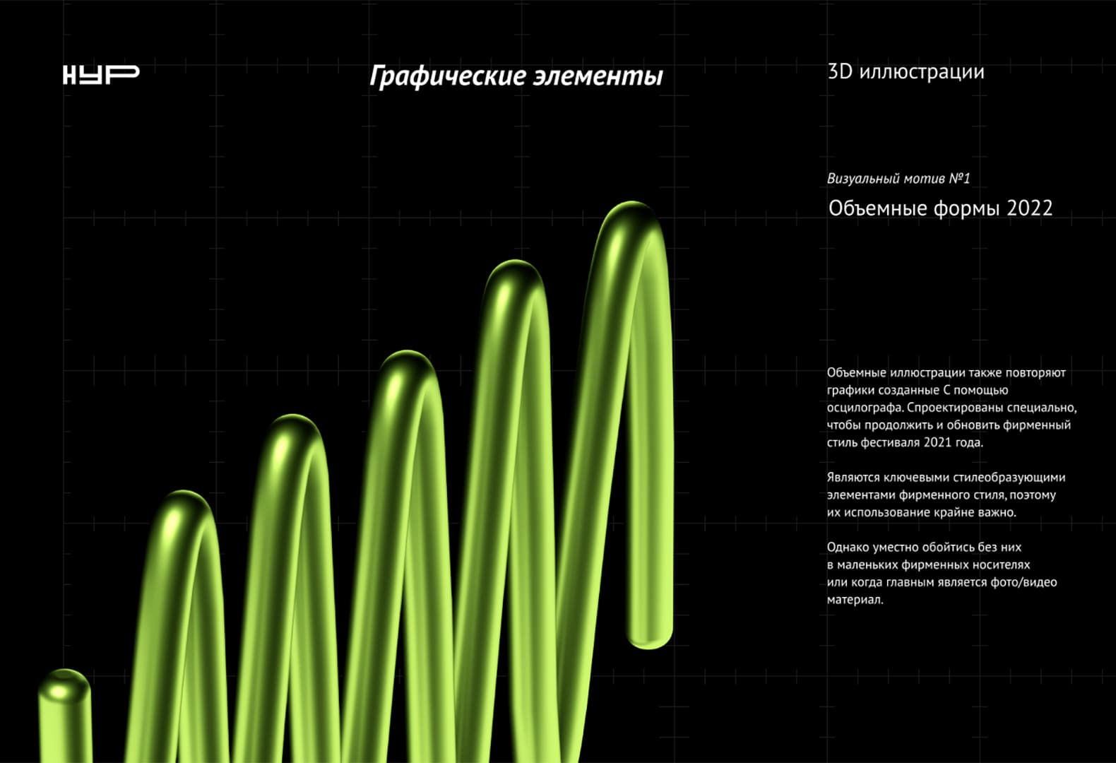 К пятилетию фестиваля команда впервые посмотрела на НУР как на проект со сложившейся историей. За предыдущие годы сформировался набор ключевых элементов: осциллографические узоры, сетки, текстуры, а также новые цветовые и типографические сочетания.