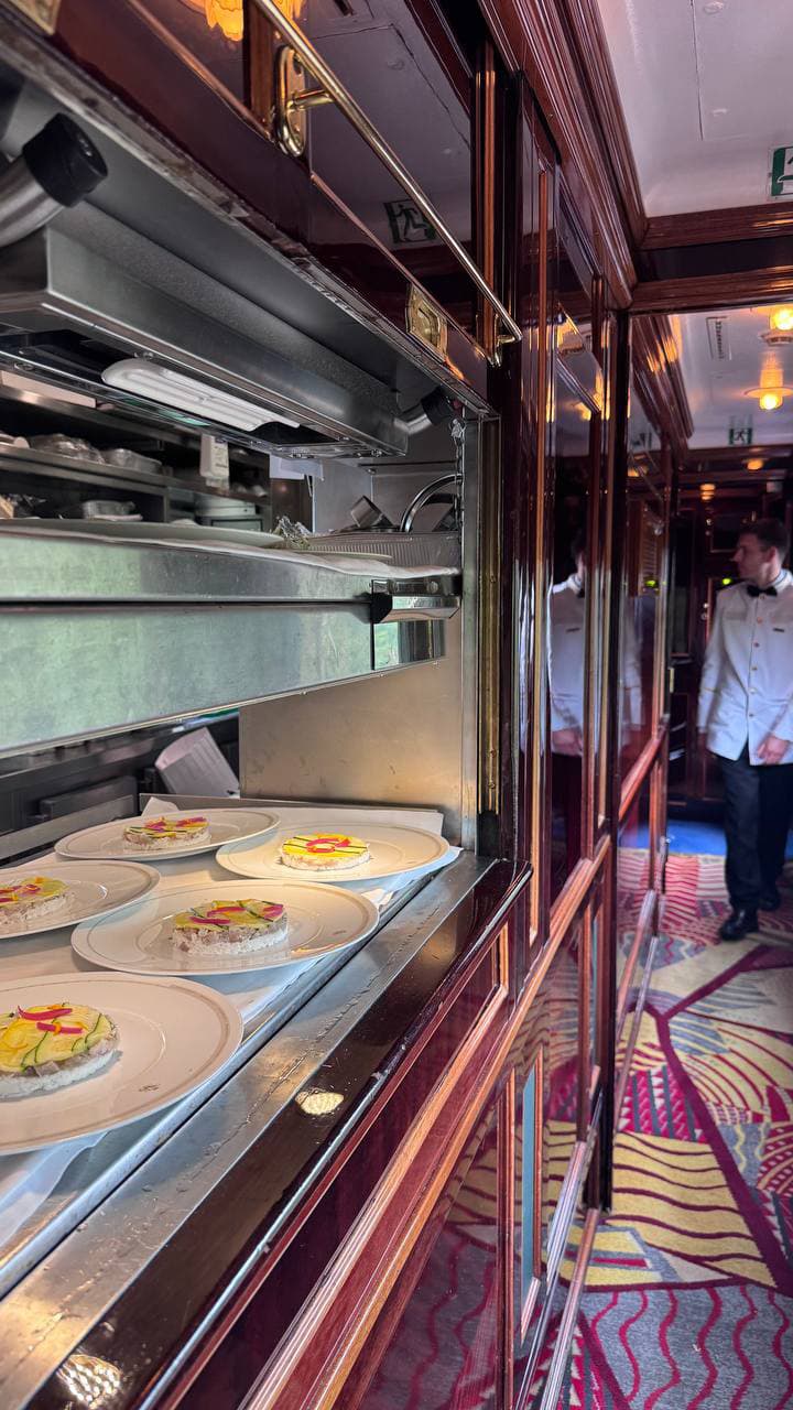 Изначально в составе поезда три ресторанных вагона, но на моем рейсе их было два: L’Oriental и Étoile du Nord. Первый оказался моим фаворитом. Он теплый и как будто театральный. В оформлении преобладает настроение ар-деко — лак и восхитительные декоративные панно с птицами, в отделке — золото и слоновая кость. Все это создает ощущение аутентичного вечернего салона 1920-х. За сезонное меню отвечает выдающийся французский шеф Жан Имбер. Атмосфера невероятная: хрустящие белые скатерти, винтажное столовое серебро, блеск бокалов и изысканная сервировка буквально переносят в мир роскоши начала прошлого века.
