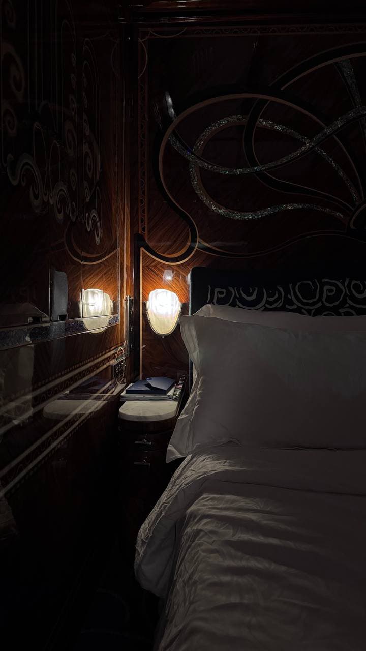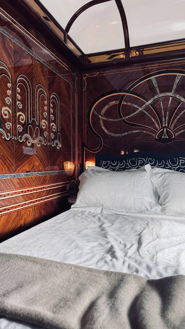 Визуально интерьер спальных вагонов «звучит» как выверенная симфония ар-деко: теплый орех и палисандр, лакированные панели с тонким маркетри, латунные ручки и номерные таблички, узкие зеркала, которые вытягивают пространство коридора, плотные шторы и глубокие оттенки текстиля. Свет здесь приглушенный и рассеянный, его будто «скульптурируют» бра и плафоны. Все собрано вручную, и это чувствуется в тактильности кромок, в точности стыков и глянце лака, в котором кинематографично отражается движение поезда. Мой номер назывался «Озеро» — название очень гармонично раскрывается в деталях интерьера: ореховые панели с инкрустациями зеленого перламутра, прохладные синие оттенки ткани, спокойные линии мебели без излишнего декора. Здесь каждый предмет работает на ощущение тишины и глубины: свет смягчает углы, текстиль охлаждает палитру, а современный бамбуковый матрас под историческим покрывалом завершает этот баланс — музейная красота в сочетании с настоящим телесным комфортом.
