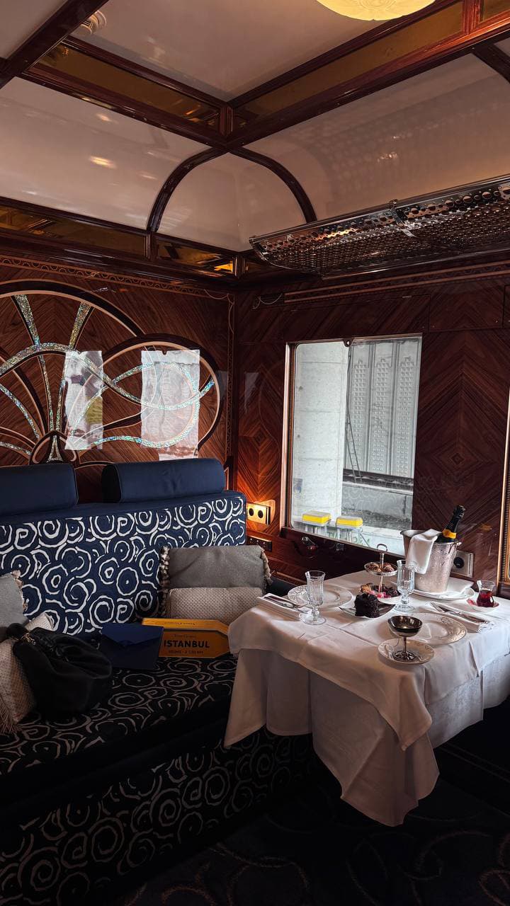 Утро первого дня началось в Стамбуле — я прилетела ранним рейсом из Милана, и уже в аэропорту меня встретили представители Восточного экспресса. На станции Bakirköy начальник поезда, обаятельный француз Бруно, проводил в «лаунж»: турецкая музыка, чай, традиционные сладости и фотографы со старинными камерами — «вылетает птичка», словно репетиция самого первого отправления 1883 года. В купе все на высшем уровне: шампанское, черная икра, мини-десерты, историческая карта маршрута и открытки с расписанием каждого дня. Хочется все рассматривать, трогать, фотографировать. До ужина — аперитив в баре и живой джаз. Дресс-код ужина (в 19:00 и 21:00 на выбор) — элегант-шик для женщин и black tie для мужчин: смокинги, длинные платья и ощущение праздника жизни. Ночью нас ждет граница с Болгарией, паспортный контроль и первый стук колес на пути к новым впечатлениям.