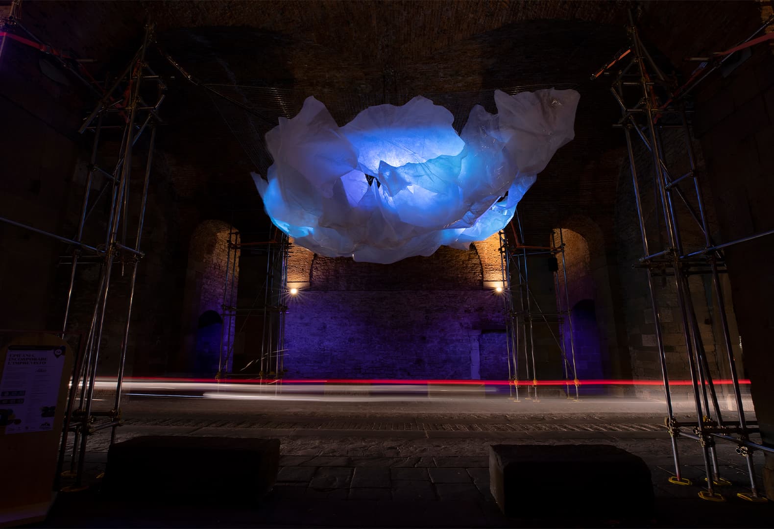 Эфемерное облако авторства Эдоардо Милези изготовлено из производственных отходов. Дизайнер представил свою инсталляцию как объект, вобравший в себя собранные во время путешествия по миру звуки, цвета и образы. Поэтический характер Incorporare l’imprevisto подчеркивается визуальной легкостью конструкции, подвешенной под сводами Palazzo della Ragione. На лицевой стороне каждого лепестка, формирующего скульптурное облако, невидимыми чернилами напечатан текст, который можно заметить только при определенных условиях окружающей среды.
