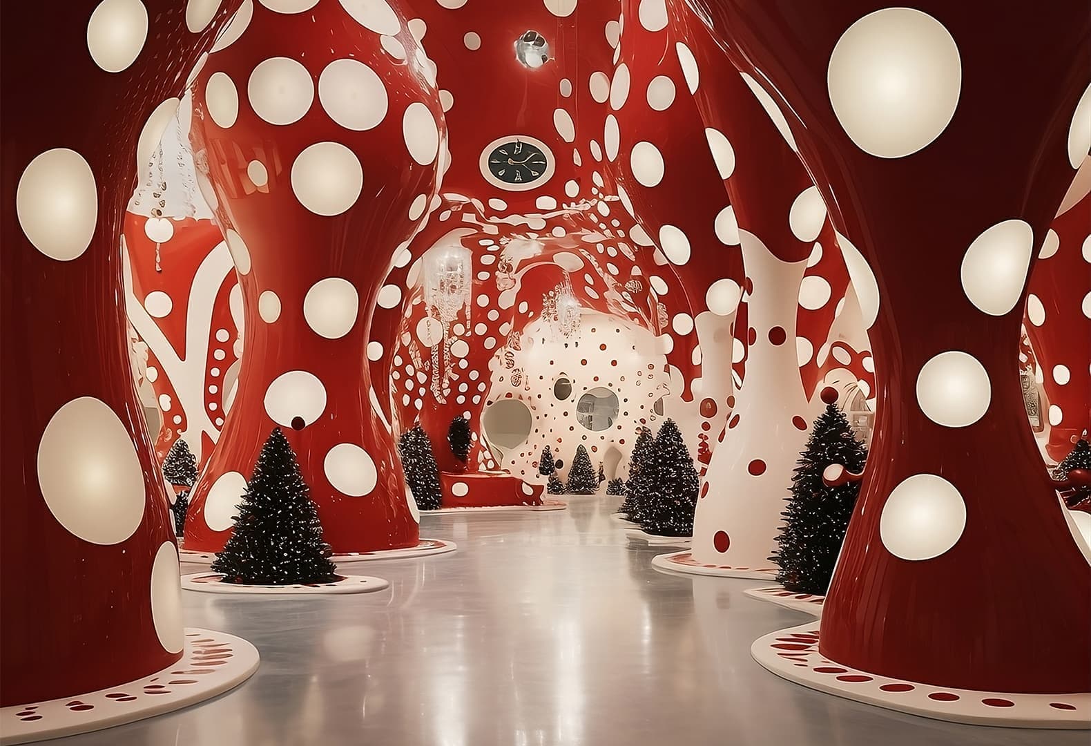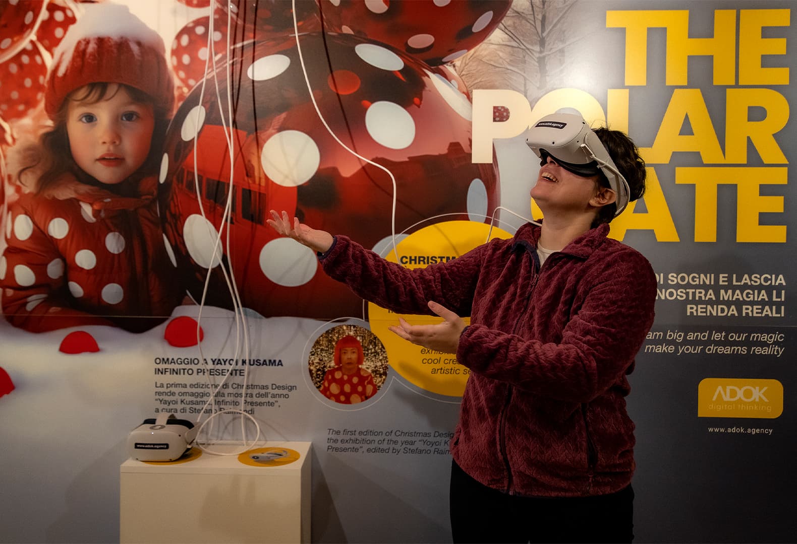 Дизайнеры компании ADOK предлагают зрителям отправиться в красочную вселенную Яёи Кусамы при помощи технологий виртуальной реальности. Надевая VR-очки, которые команда представляет как портал в альтернативный мир, человек погружается в пространство чудес и фантазий. По задумке авторов в яркой иллюзорной диджитал-вселенной, раскрашенной в узнаваемый крупный горох, живет Санта-Клаус и царит дух Рождества.