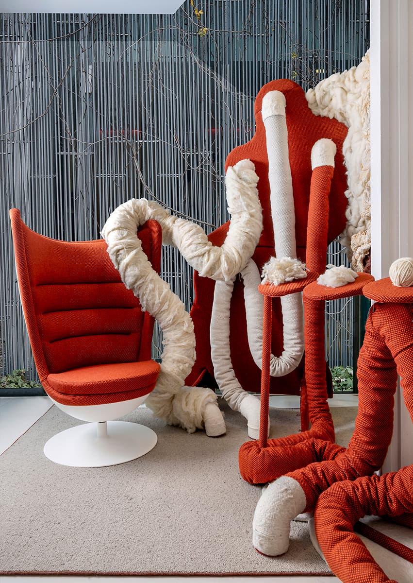 Бренд текстиля Gancedo представил в своем шоуруме несколько выставочных проектов, в том числе En constante movimiento, подготовленный совместно с художницей Корал Антолин. По ее словам, концепция родилась из наблюдения жизни как непрерывного потока. «Выставка фокусируется на внутренних и внешних движениях, которые проходят через нас, на решениях, которые мы принимаем, на путях, по которым мы идем, и на распутьях, которые нас формируют», — рассказывает Антолин. Экспозиция объединила чувственные текстильные панно художницы и кастомизированную версию ковра Gancedo из коллекции Pompoms Rugs, созданную специально для проекта.