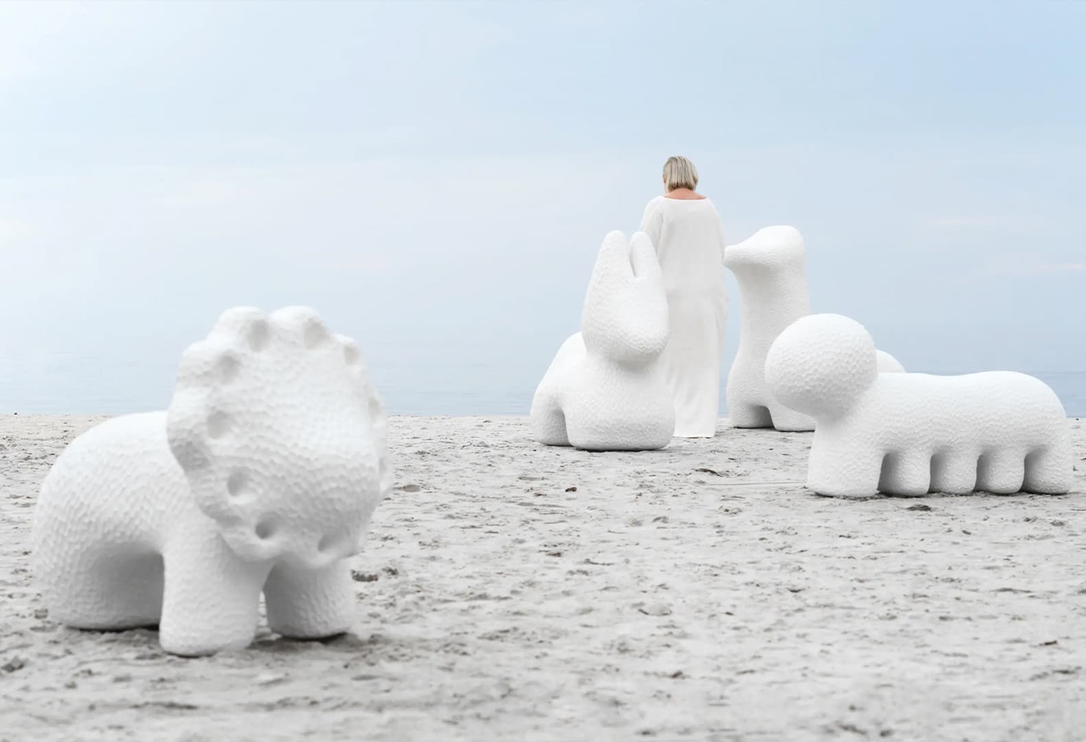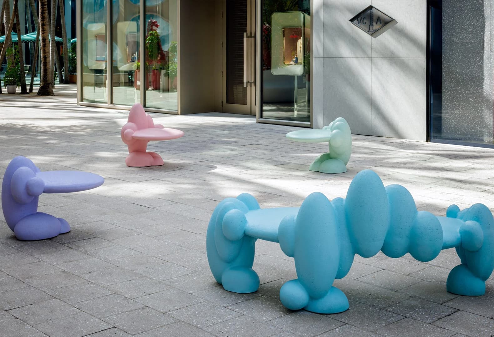 Во время ярмарки в дизайн-квартале Майами появились скульптурные объекты биоморфных форм. Так британский дизайнер Лара Бохинц презентовала свою новую коллекцию outdoor-мебели. Все объекты выполнены из пробки и окрашены в нежные пастельные тона. Несмотря на замысловатые объемные силуэты, скамьи, кресла и столики получились эргономичными и функциональными.