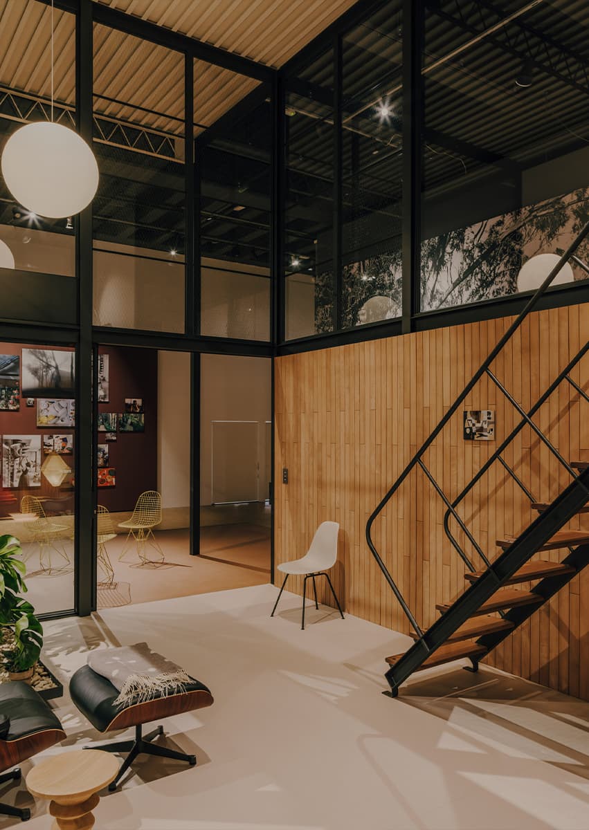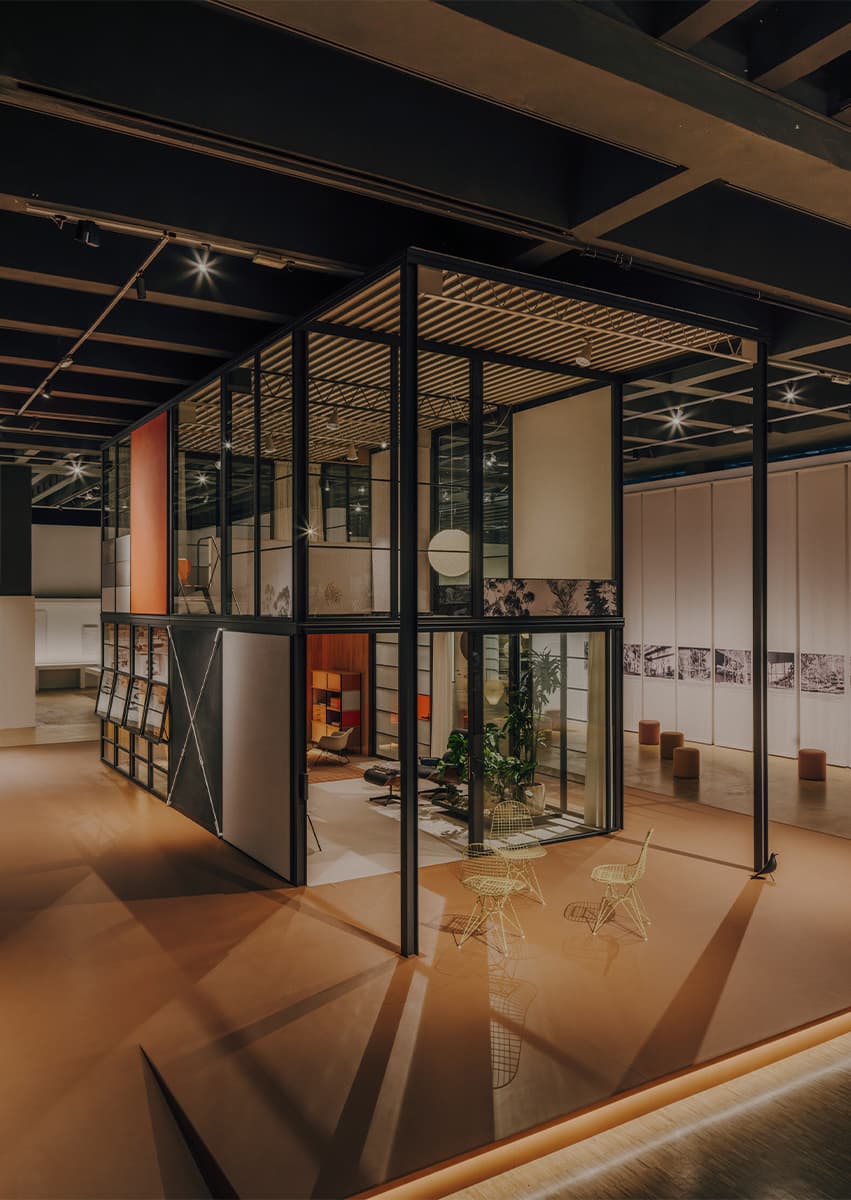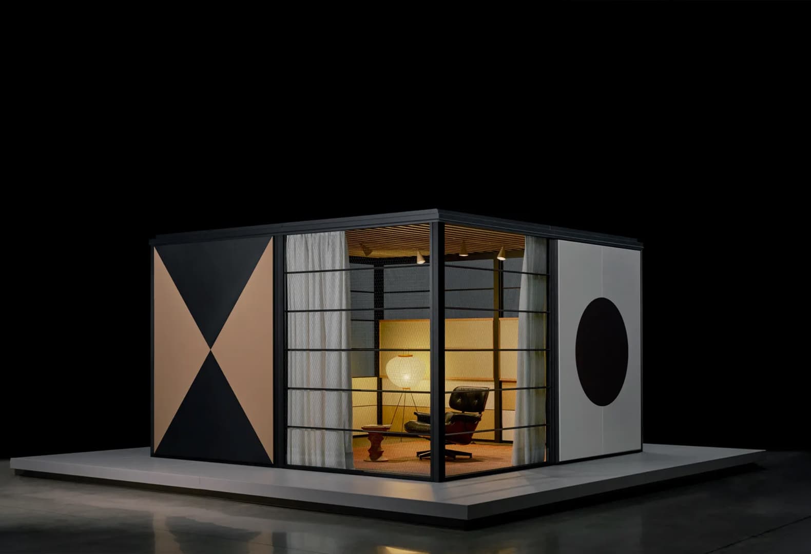 Центральный объект экспозиции — двухэтажный архитектурный объем. Он построен с использованием модульной сборно-разборной системы Eames Pavilion System, разработанной под руководством давнего сотрудника Eames Office и консультанта по дизайну Эккарта Мейза. По его словам, она не копирует Eames House, но в то же время продолжает его ДНК.
