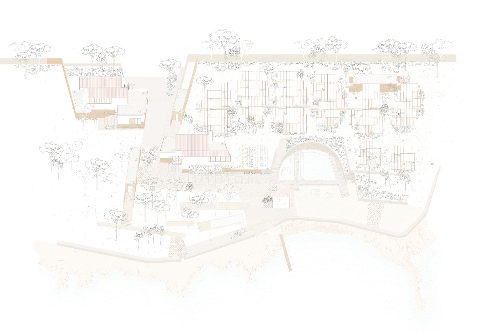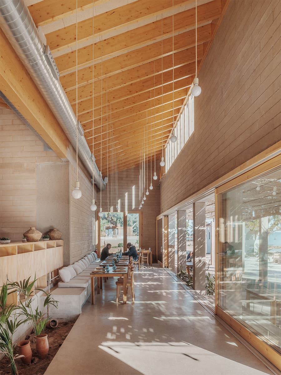 Отдавая приоритет позитивному опыту гостей пространства, архитекторы создали в каждом уголке комплекса настоящий природный оазис из зеленых насаждений — сосен, ароматных местных растений, зарослей тростника и виноградной лозы. Кроме того, немаловажный акцент в проекте — формирование среды для общения. Так в центральных зданиях появились большие общие помещения и зоны для встреч, а функциональные комнаты в павильонах были оборудованы общественными садами и уютными верандами.