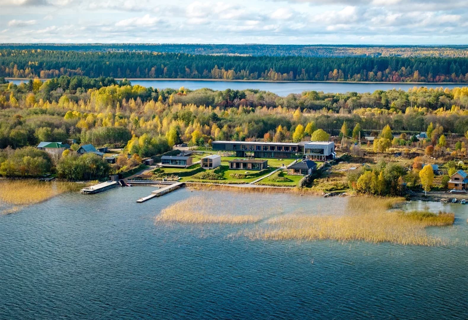 Бутик-отель «Заонежье», расположенный на берегу Онежского озера, — загородный проект петербургского архитектурного бюро Rhizome. Главным источником вдохновения для команды стал чилийский отель Estancia Rilán с его гармоничной интеграцией комфортной среды в дикую природу.