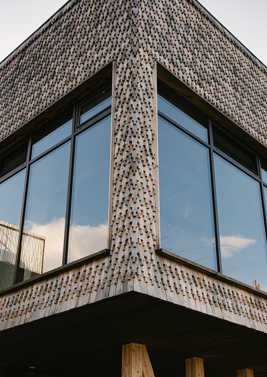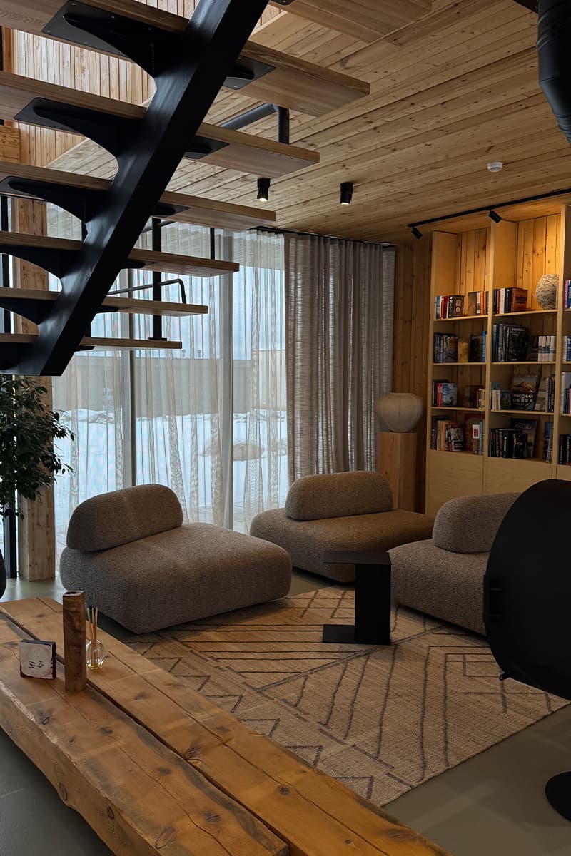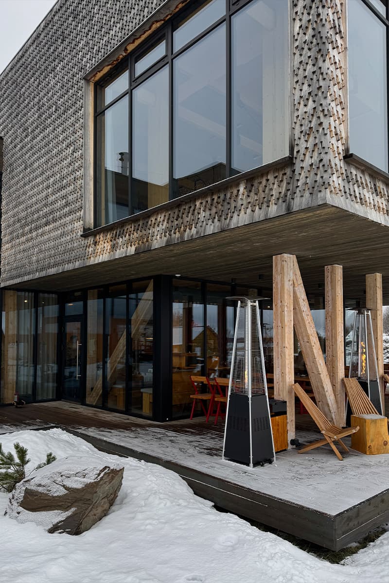 Акцентной деталью в интерьере также стал городчатый лемех — особый вид обработки осиновых досок, предшественник современной черепицы. Такое же покрытие используется в отделке куполов храмов на острове Кижи, построенных в 1714 году. Остров находится в часе езды от проекта, поэтому отель также предлагает гостям отправиться на экскурсию к этой достопримечательности.