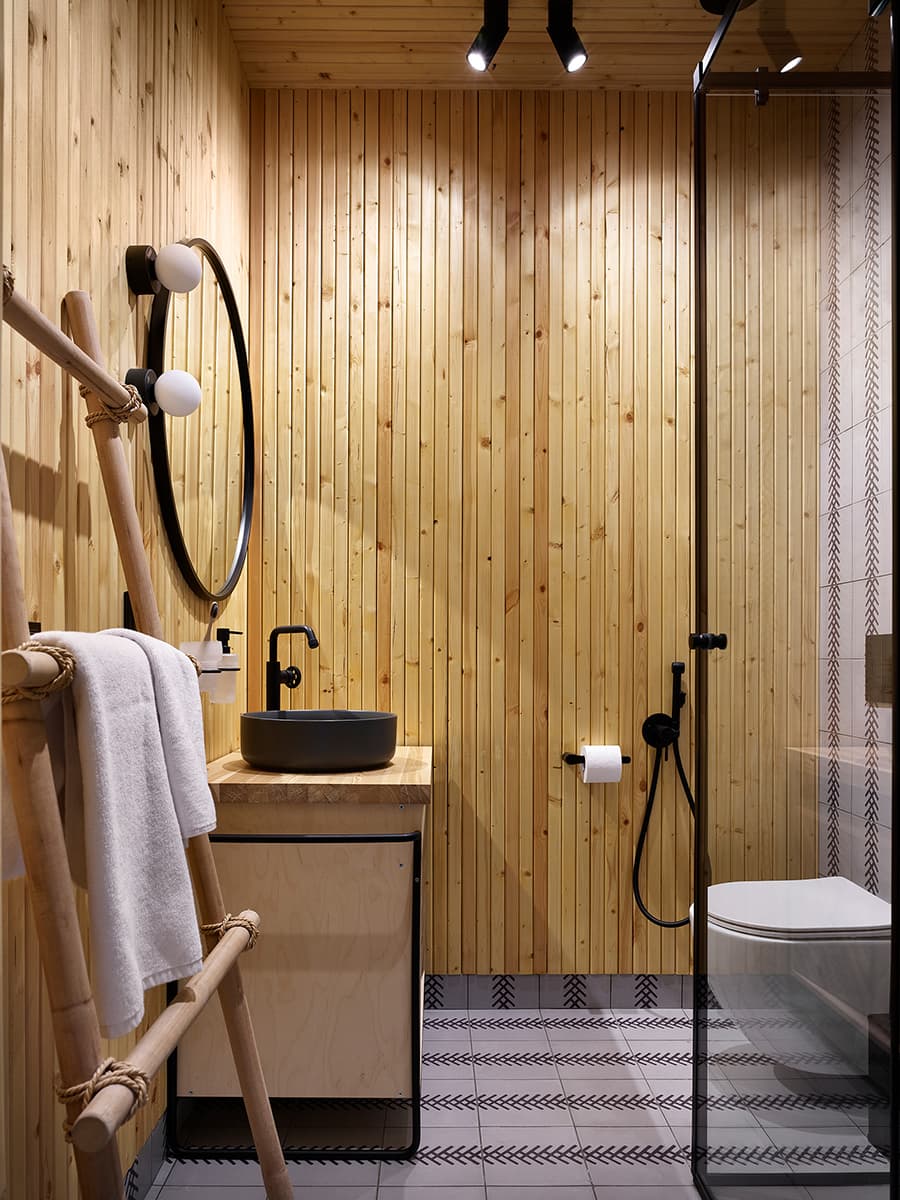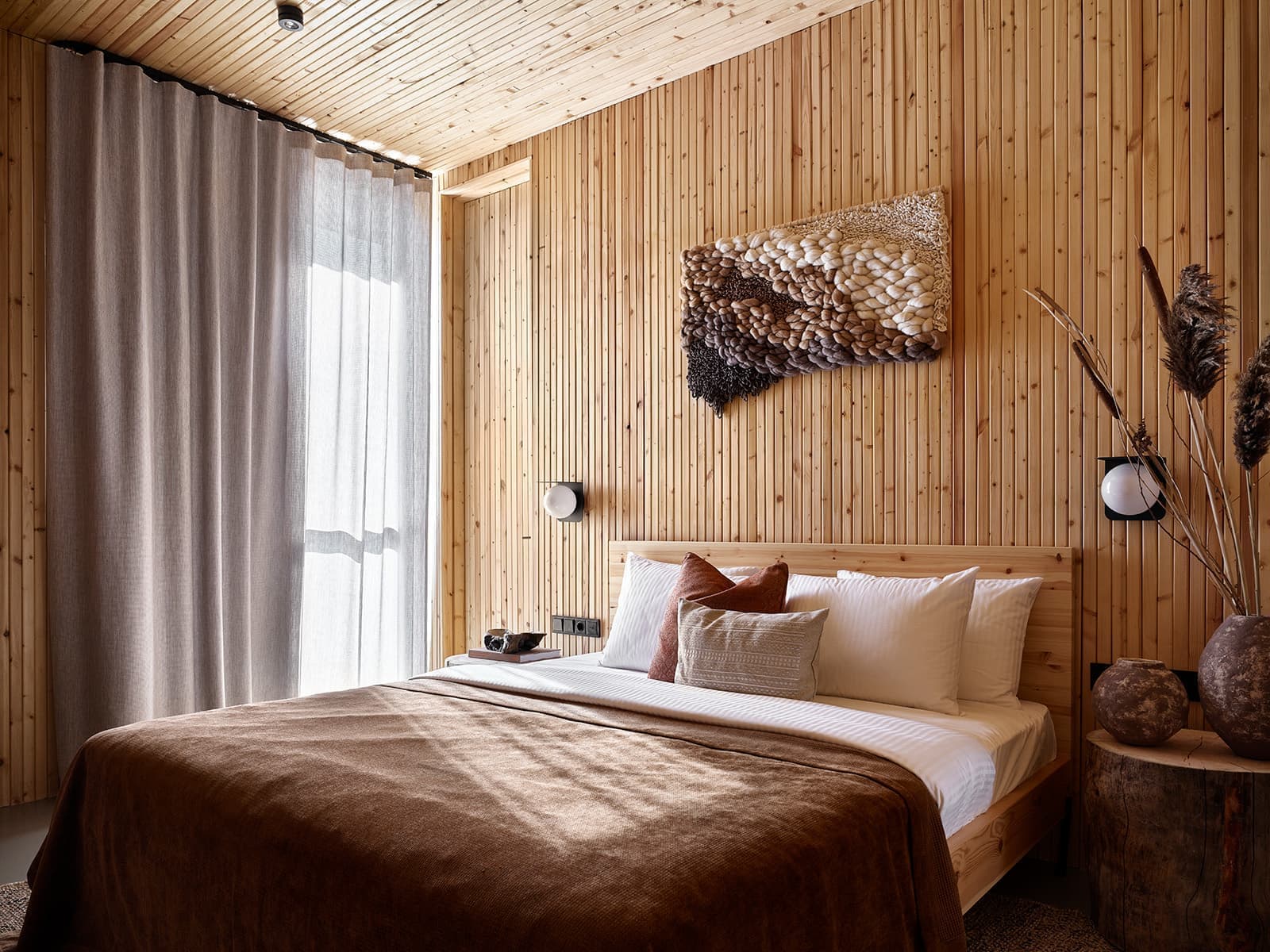 Панорамные окна пропускают во внутренние пространства много естественного света. Светлые деревянные элементы гармонично сочетаются с текстильным декором в номерах и плиткой в санузлах. Уютную атмосферу создают в том числе разные сценарии освещения, которые можно менять в зависимости от времени года и суток.