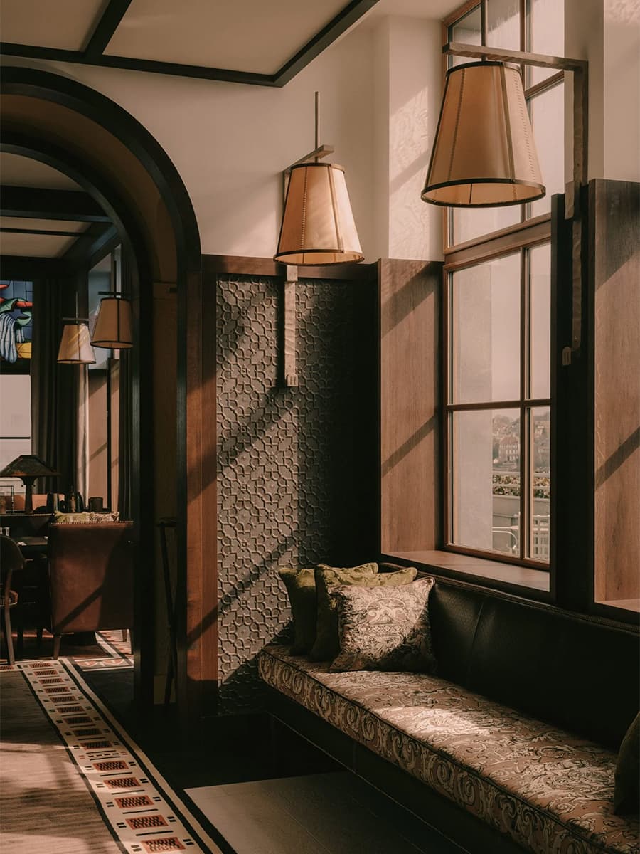 Обеденный зал под крышей отличается теплой, уютной атмосферой. Натуральное дерево, кожа, мягкое освещение, зеленая текстурированная кожа на колоннах и терракотовая плитка создают ощущение дома вне времени. Интерьер дополняют фотографии, напоминающие о вымышленной, но живой истории места.
