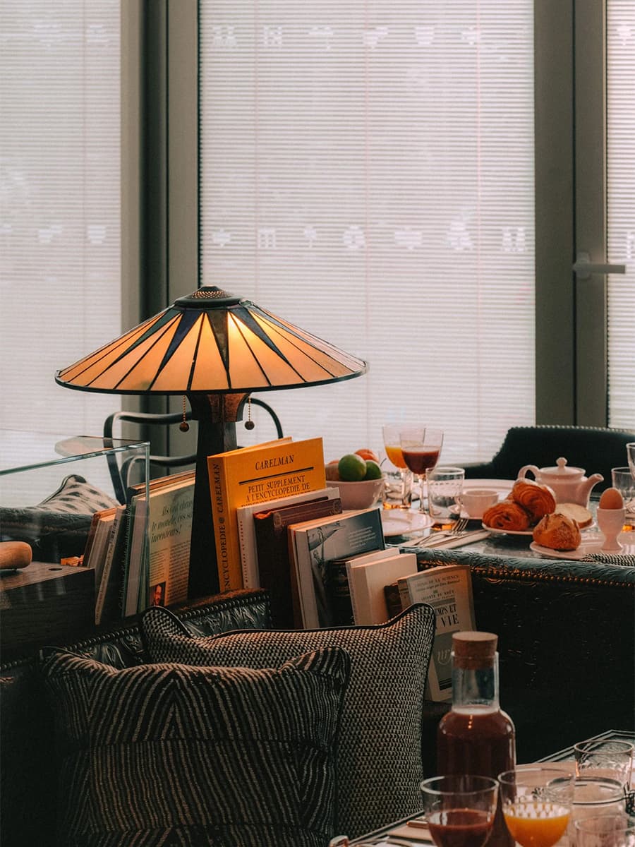 На верхних этажах расположены приватные гостиные и столовые общей площадью 300 кв. м. Эти универсальные помещения предназначены для встреч, литературных чтений, винных дегустаций, медитаций и брейнштормов. Поднявшись на последний, девятый этаж, гости попадают в La Maison de Manfred — пространство, воссоздающее атмосферу унаследованного дома. Семейная столовая предлагает возможность собраться вдвоем, с друзьями или всей семьей, чтобы разделить теплые моменты. С террасы и садов открывается панорамный вид на город.