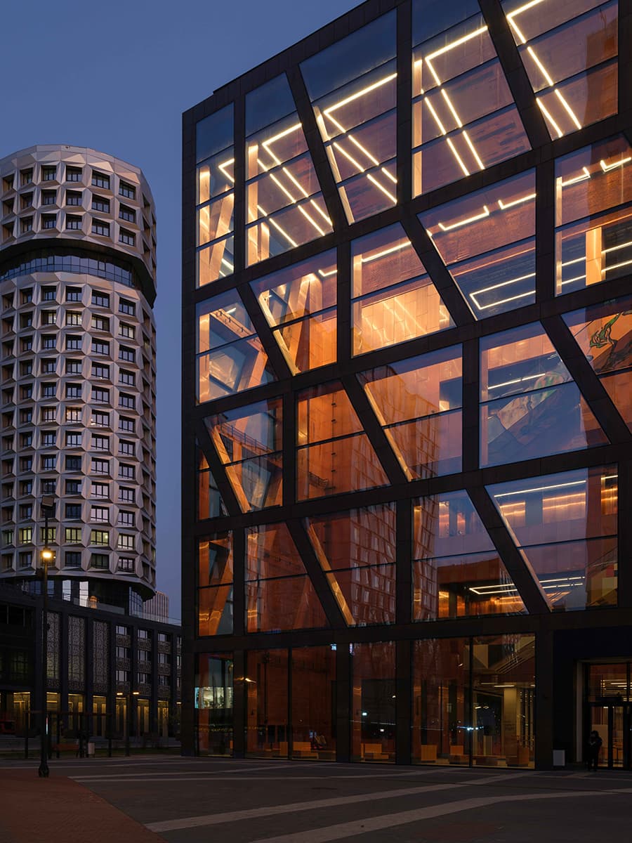 Именно этот окружающий контекст, а также история места легли в основу концепции, предложенной московским бюро СПИЧ под руководством Сергея Чобана. Так, при разработке проекта архитекторы вдохновлялись промышленной эстетикой бывшего автомобильного завода имени Лихачёва. В результате здание выглядит как массивный кубический объем с выверенными пропорциями, помещенный внутрь структуры в виде закольцованной трапециевидной сетки.