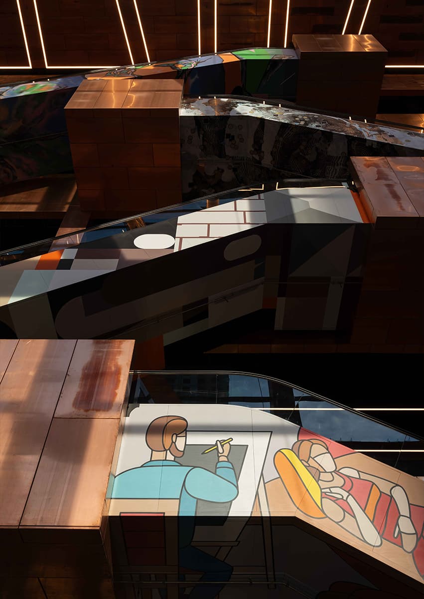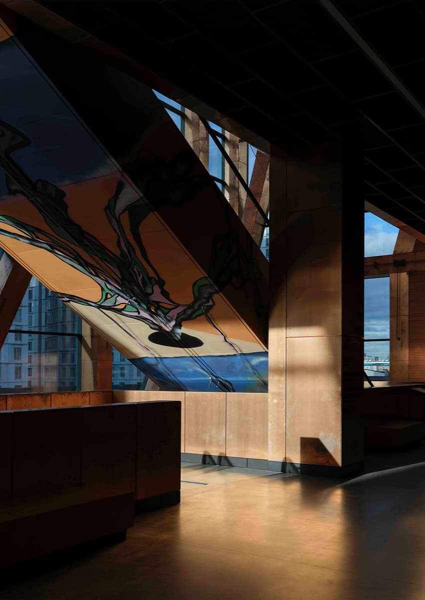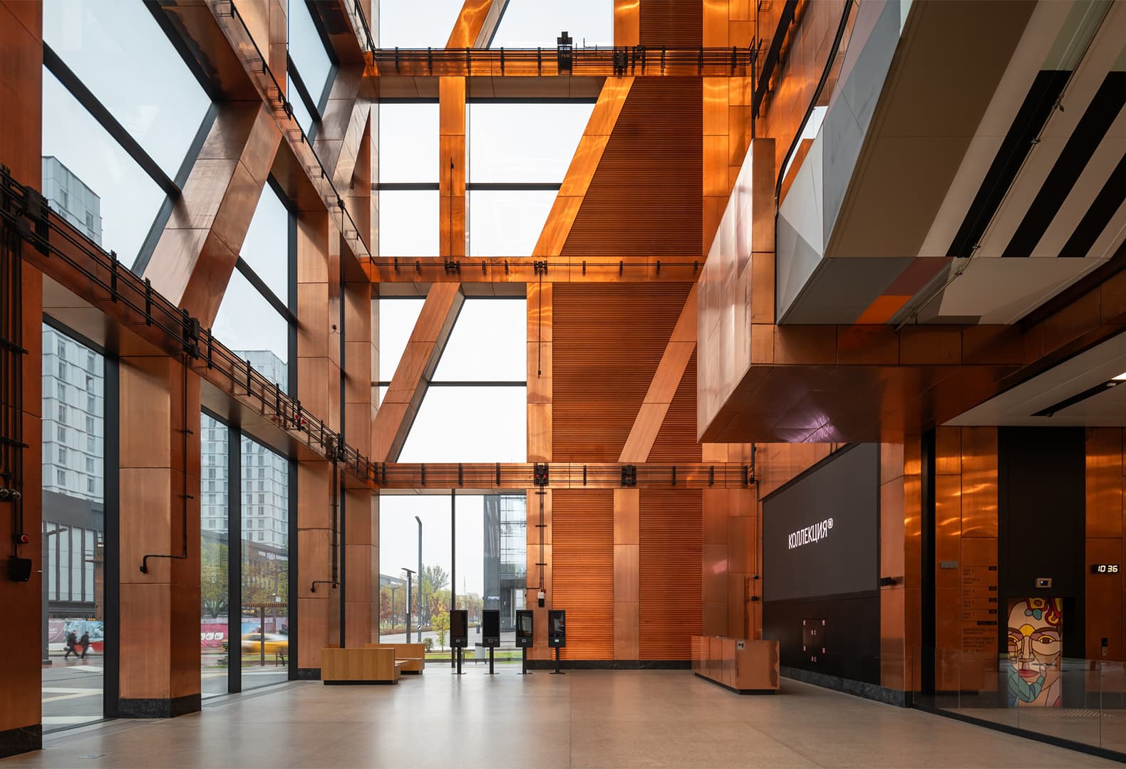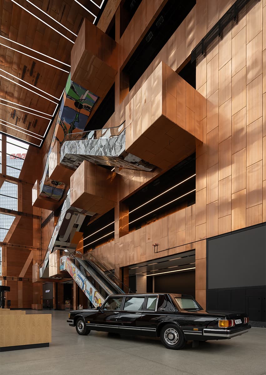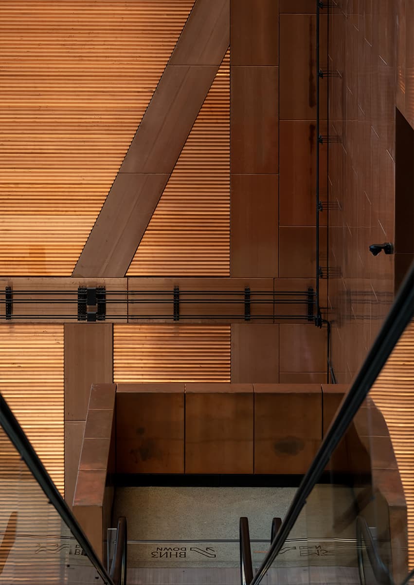 Главным материалом, который авторы проекта использовали как для внешней, так и для внутренней отделки сооружения, стала медь. Такой выбор — тоже дань уважения индустриальному наследию локации, ведь именно этот металл остается одним из ключевых в производстве автомобилей.
