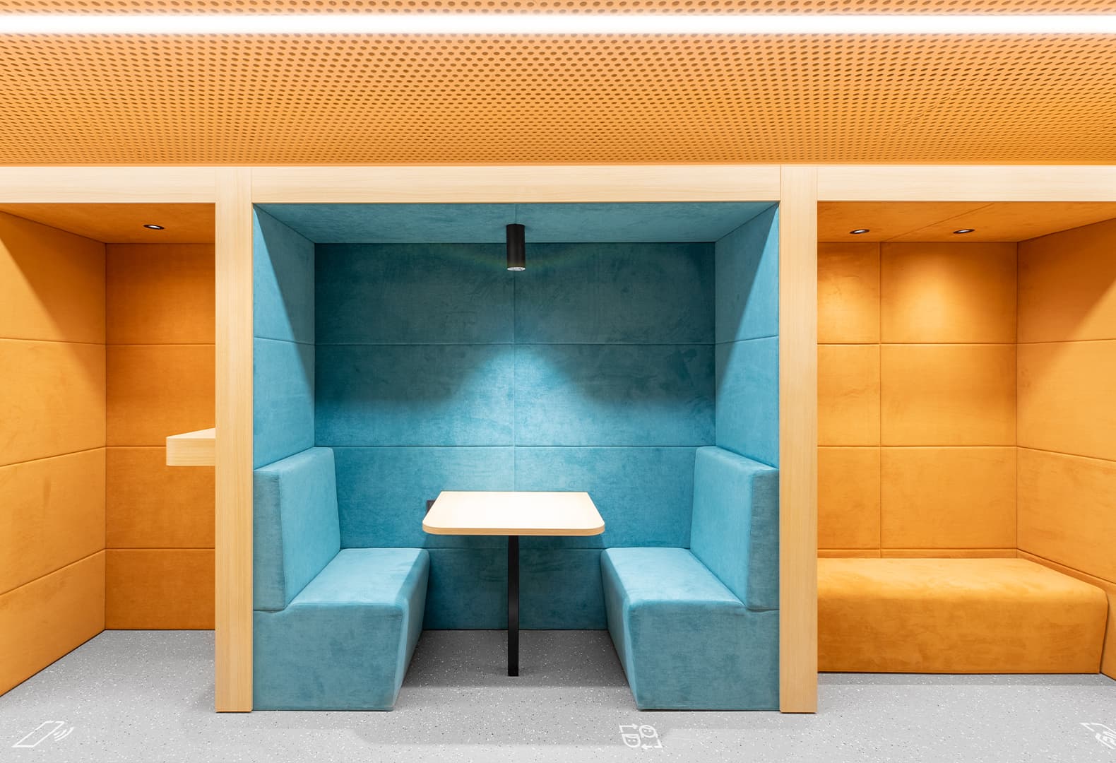 - Переговорные комнаты, зоны командной работы, проектные комнаты и пространства офисных кафе. Все эти пространства предназначены прежде всего для встреч. При этом они отлично подходят не только для мозговых штурмов и совместной работы, но и для обучения. В их дизайне особую роль играют звукопоглощающие решения: акустические панели, зеленые стены и напольные ковровые покрытия. Они снижают уровень шума и повышают концентрацию, что очень важно для комфортного процесса обучения сотрудников.