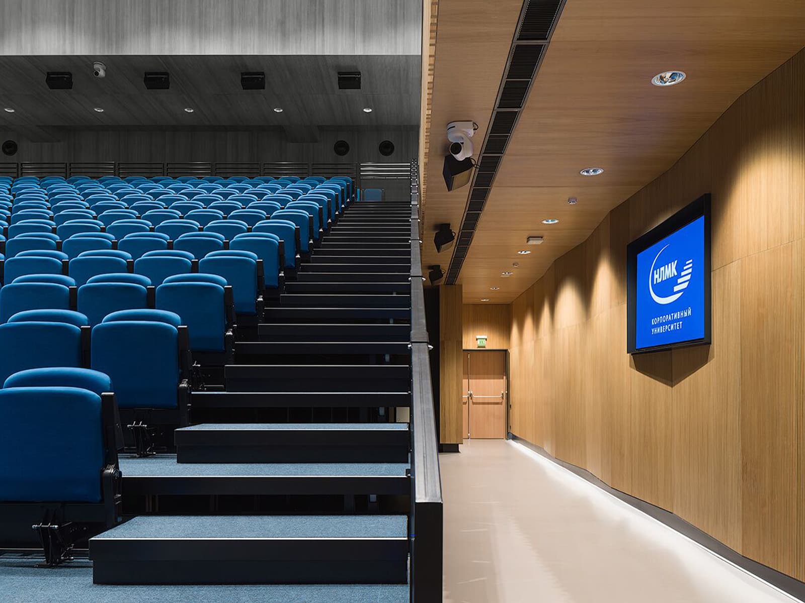 Сердцем корпоративного университета стал многофункциональный концертный зал, который, помимо основной функции, выполняет еще и роль открытой площадки для переговоров, выставок или мозговых штурмов. Это стало возможным благодаря системе трансформации зрительских рядов, которая позволяет за десять минут полностью изменить облик зала.