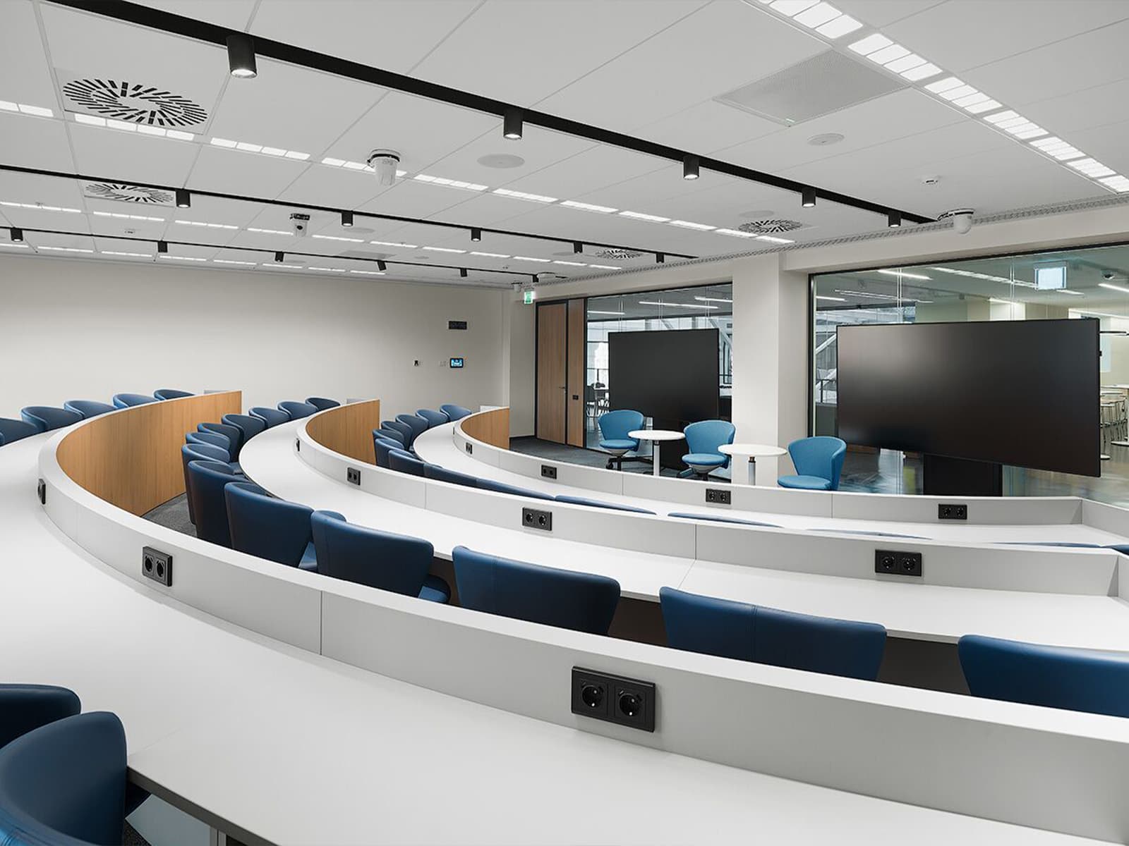 Современные компании все чаще переосмысляют роль офисного дизайна, превращая его из простого инструмента организации пространства в стратегический ресурс. Корпоративные университеты в офисных центрах — это места, где рождаются идеи и развивается потенциал сотрудников. Такие зоны представляют собой как помещения с конкретной функцией, так и универсальные пространства, подходящие для проведения тренингов и мастер-классов, организации корпоративных мероприятий и выставок. Обучение в подобных пространствах стимулирует творческое мышление и интерес к познанию нового. Часто даже сам процесс обучения становится частью корпоративной культуры компании. Образовательные зоны в офисах могут включать в себя: