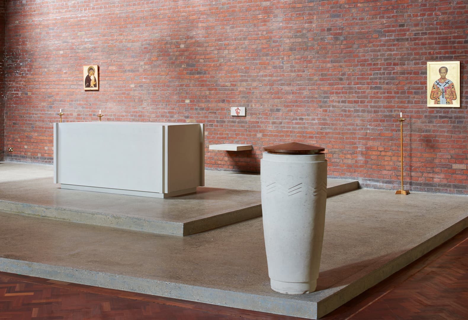 Еще один современный дизайнер, который интересуется храмовой архитектурой и сакральной обстановкой церквей, — британец Макс Лэмб. Так, для англиканской церкви в Южном Лондоне он разработал серию мебели и церковных атрибутов. Среди них алтарь из известняка, который соответствует лаконичному убранству модернистской церкви. Тот же материал он использовал для изготовления пары подсвечников и Пасхальной свечи: все они отшлифованы дизайнером вручную.