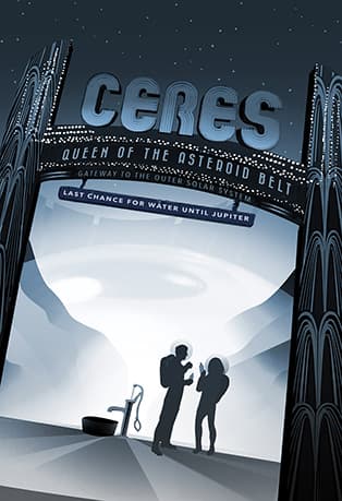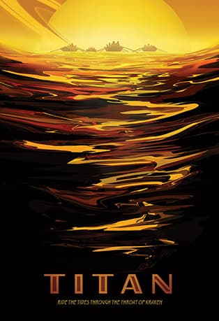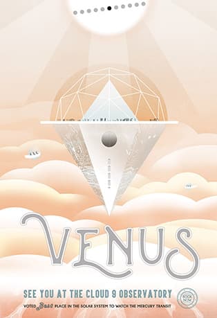 Эти плакаты, выполненные в ретро-стилистике, пополнили коллекцию прошлогодних постеров, которые рекламировали другие планеты как направления для путешествий. Путешественников приглашают увидеть полярное сияние на Юпитере и посетить обсерваторию «Cloud 9» на Венере. Каждый плакат NASA подчеркивает особенности планеты, которые могут заинтересовать потенциальных путешественников. Где-то, например, особенно сильная гравитация, которую можно использовать для экстремальных видов спорта, а где-то – два заката вместо одного. Эти винтажные плакаты про космические путешествия – детище дизайнеров JPL. Студия работает с учеными и инженерами для визуализации сложных научных тем.