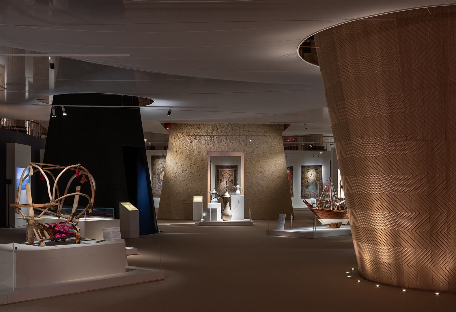 Наш первый совместный проект — выставка «Катар между морем и пустыней. Искусство и наследие» для Российского этнографического музея в Санкт-Петербурге. Мы разработали креативную концепцию и полностью реализовали ее. Ключевым элементом экспозиции стала тканевая инсталляция над центральной частью зала — символ соединения моря и пустыни.